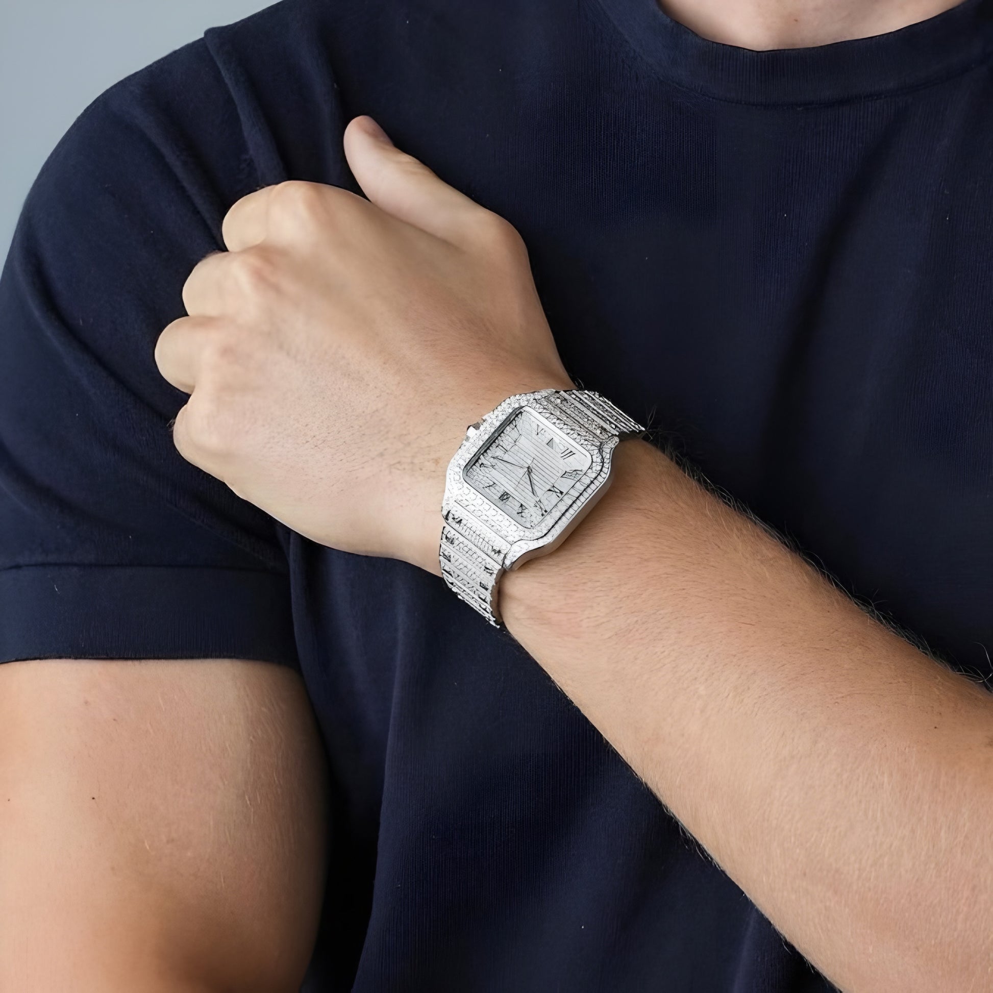 Le terme “Bust Down” signifie que chaque surface de la montre est sertie à la main :